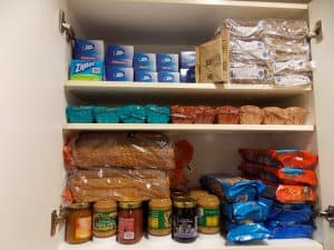 [This photograph shows a kitchen cabinet containing ingredients for lunches — loaves of bread, jars of peanut butter and jelly, and boxes of cookies — along with boxes of sandwich bags and paper bags.]