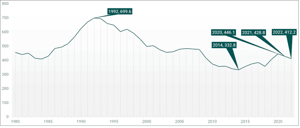 In 2022 the state’s index violent crime rate fell from the previous year, as was also the case in 2021. Figure 1 shows the rate of index violent crime per 100,000 people in North Carolina over 40 years.