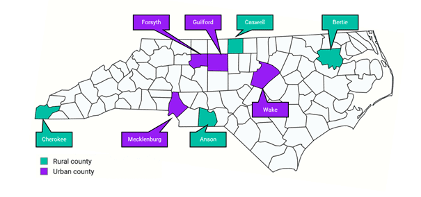 To explore this, I looked at those same police data over ten years for a set of urban and rural counties. Because of the national attention on urban crime, I looked at index violent crime trends in the four North Carolina counties with the largest populations: Forsyth, Guilford, Mecklenburg, and Wake. And because one in three North Carolinians live in a rural area, I also looked at trends in four rural counties that were both geographically diverse and have complete data for the past ten years: Anson, Bertie, Caswell, and Cherokee (see Figure 2).