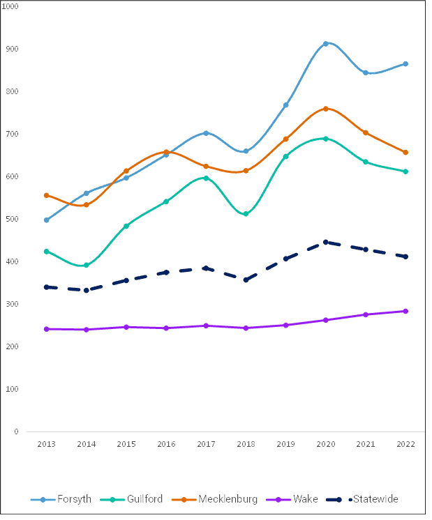 Additionally, there is considerable variation in violent crime rates for these counties. For example, in 2022, the index violent crime rate for Forsyth was three times Wake County’s rate.