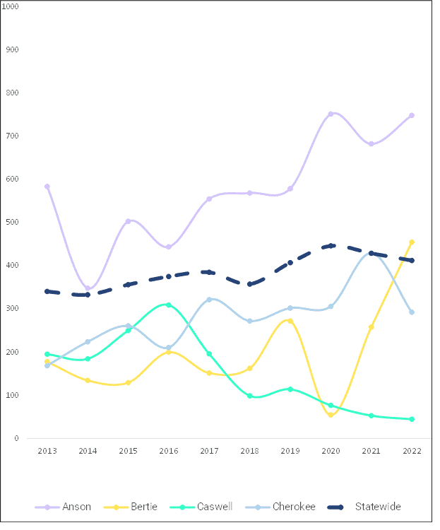 Both the level of and trend in the index violent crime rate in Anson County look a lot like the three urban counties of Forsyth, Guilford, and Mecklenburg. Also, the rate in Anson is above the statewide average, whereas the other three rural counties are generally below the average (Bertie in 2022 is slightly higher than the statewide average).